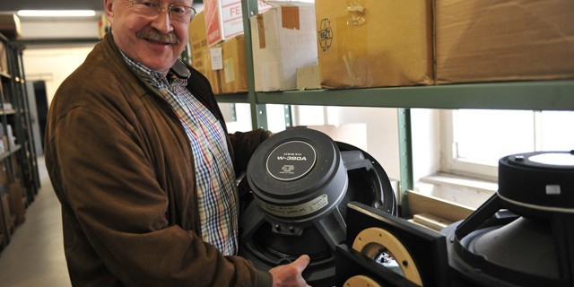 H.Winters đang kiểm tra lại thiết kế của Acapella Violon MK 6 trên máy tính. Trên kệ là hồ sơ của hàng loạt các model khác của Acapella